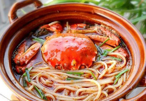 11. 煮開的米粉翻動(dòng)一下,將大閘蟹煮熟煮透。